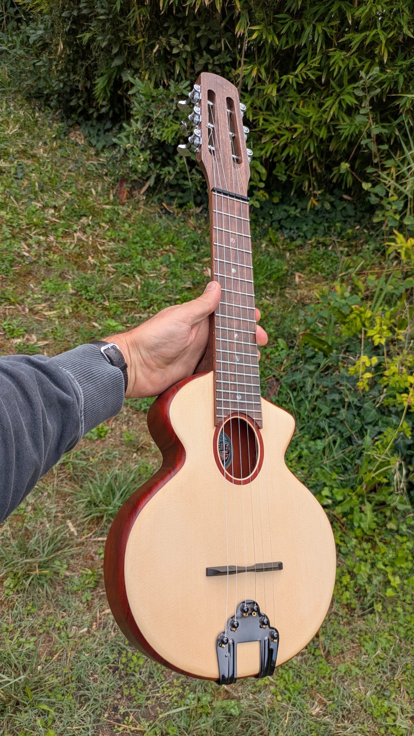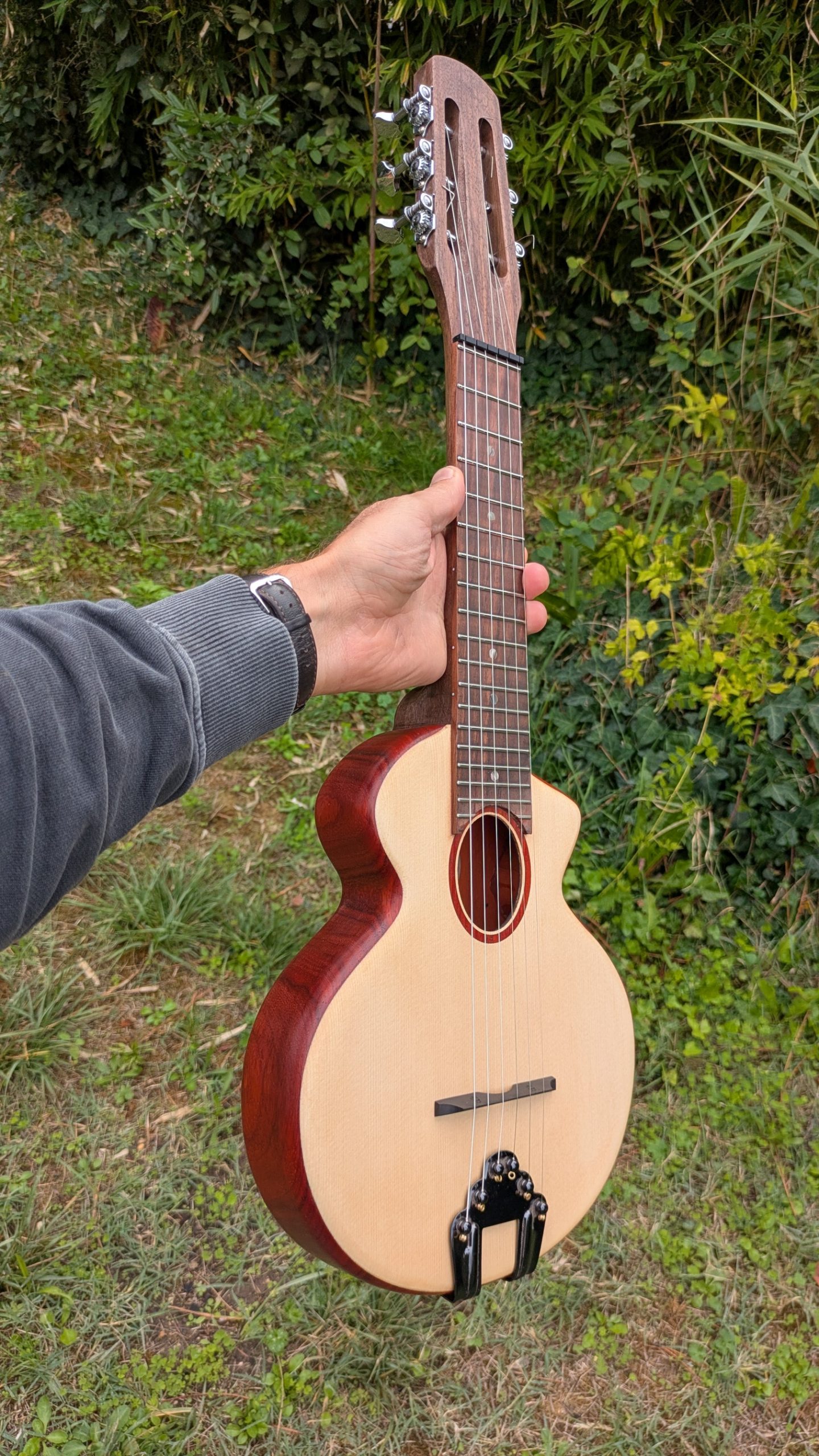 le manche est en noyer la table les éclisses et le fond sont en un seul bloc de padouk massif, la touche en ébène, le chevalet en ébène.  a une superbe projection et une très belle définition du son.