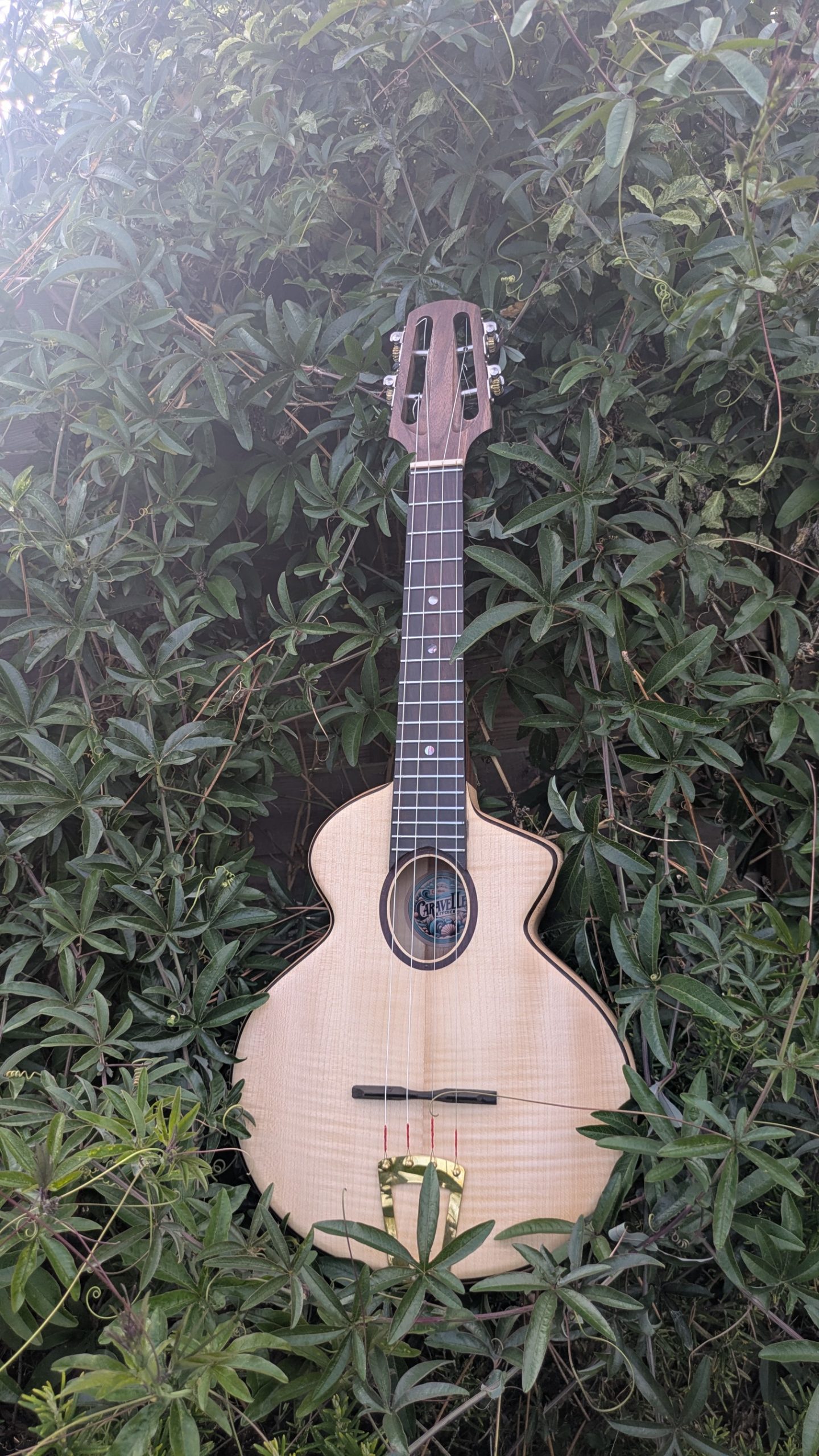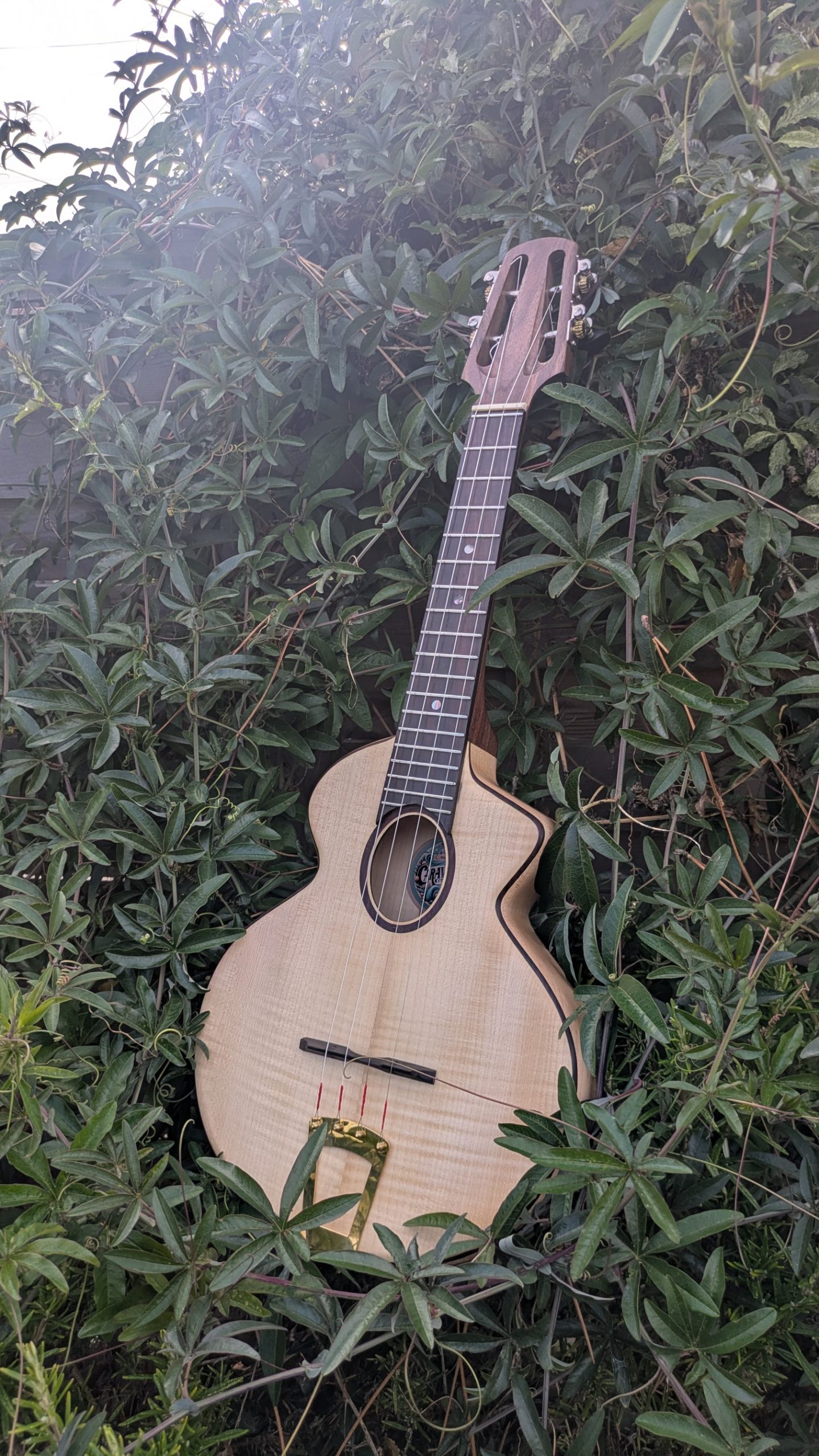 le manche est en noyer la table les éclisses et le fond sont en un seul bloc d’érable massif avec des filets en palissndre, la touche en ébène, le chevalet en ébène.  a une superbe projection et une très belle définition du son.