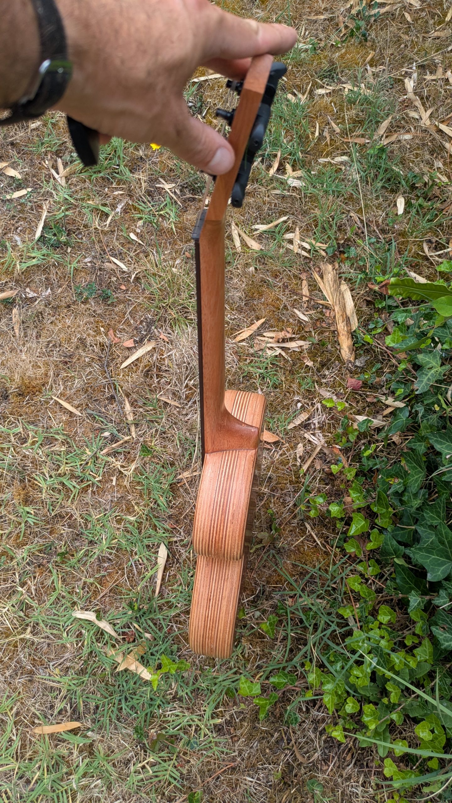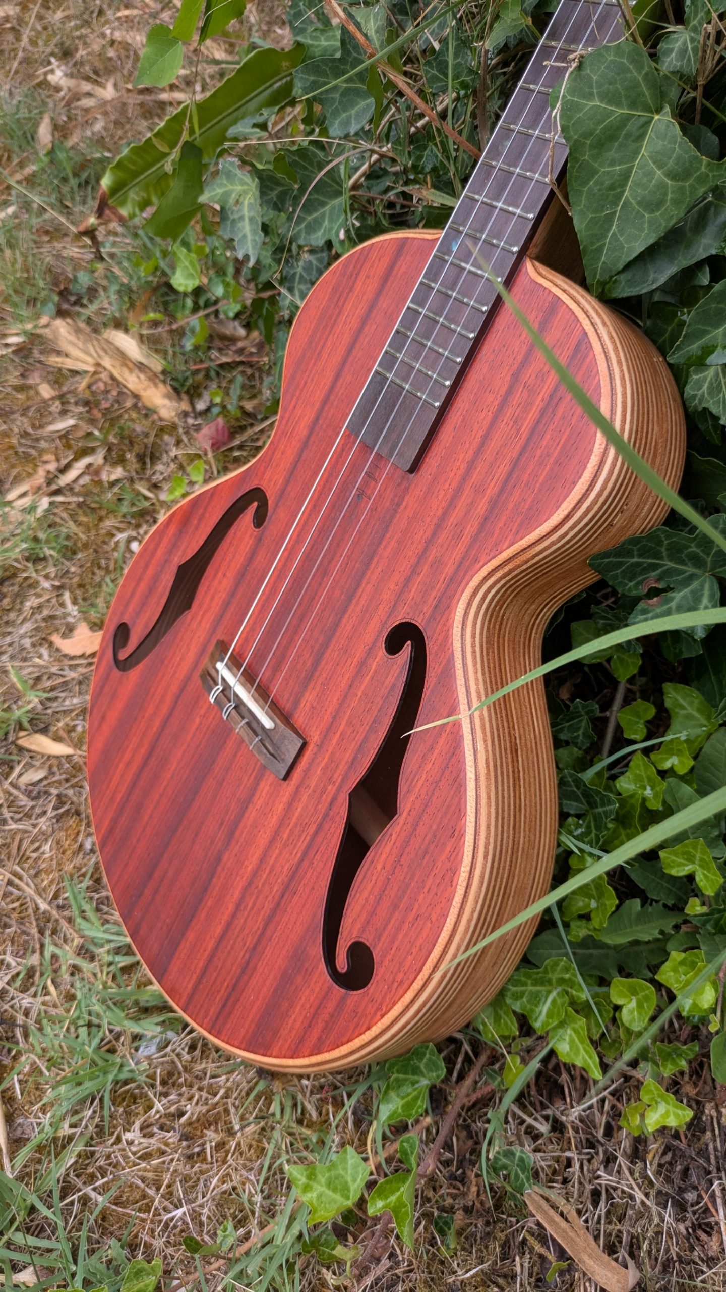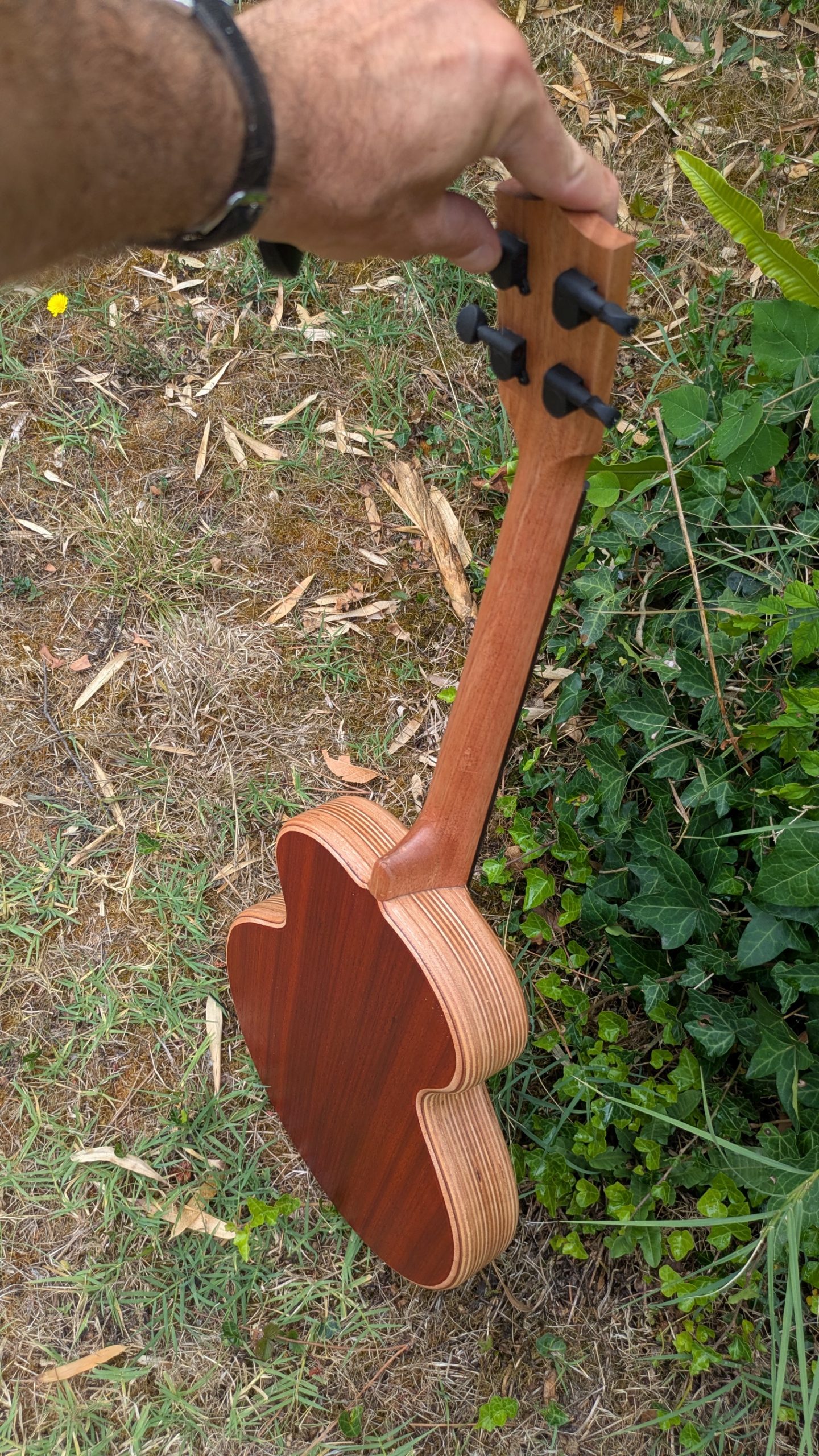 voici ici une nouvelle gamme de ukulele dont la table et le fond sont en multipli de padouk, auquel est fixé un manche en okumé massif. Avec une touche en ébène, et un chevalet en ebène.