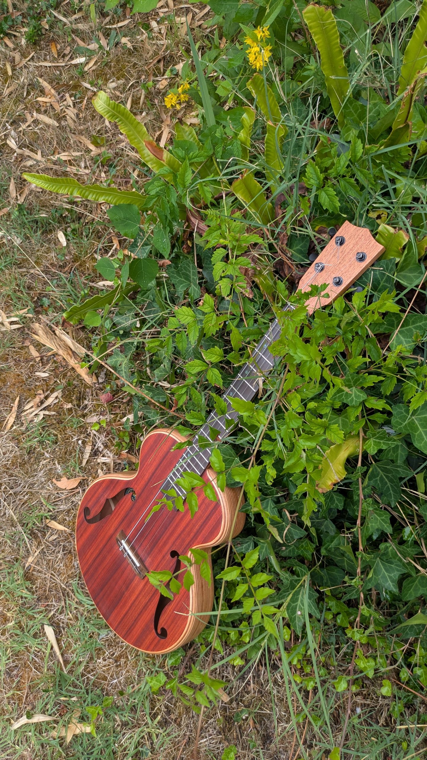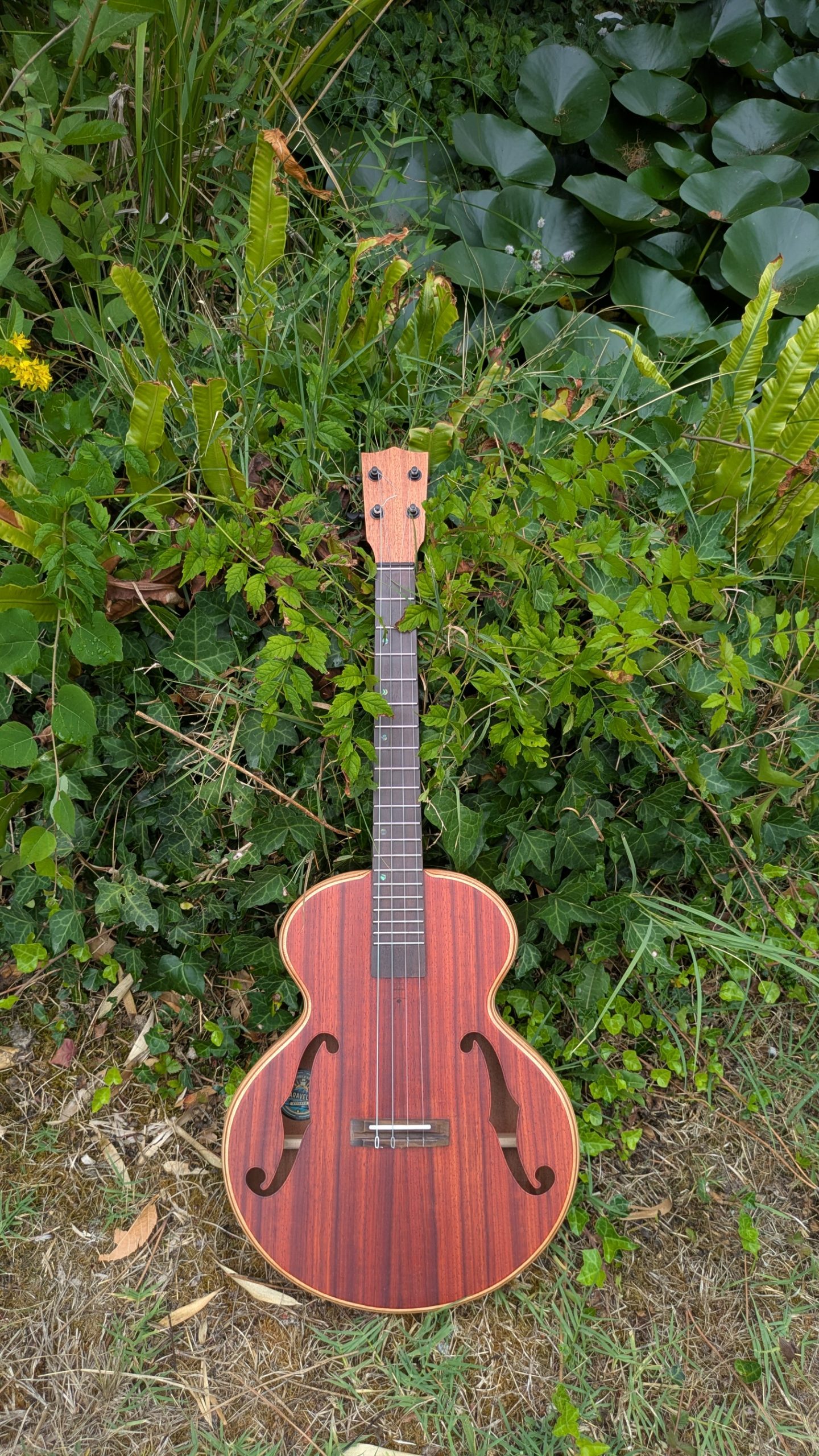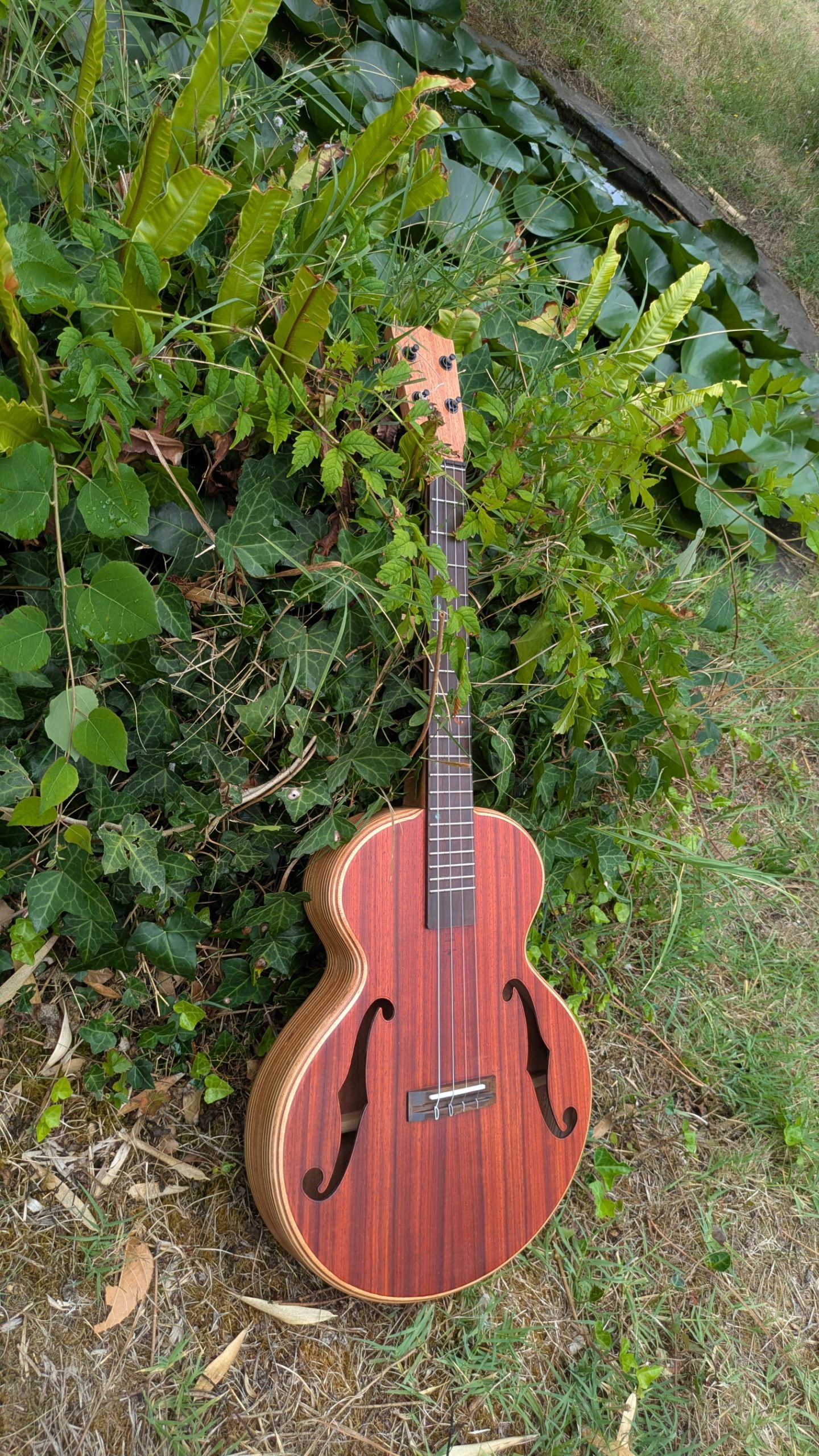 voici ici une nouvelle gamme de ukulele dont la table et le fond sont en multipli de padouk, auquel est fixé un manche en okumé massif. Avec une touche en ébène, et un chevalet en ebène.