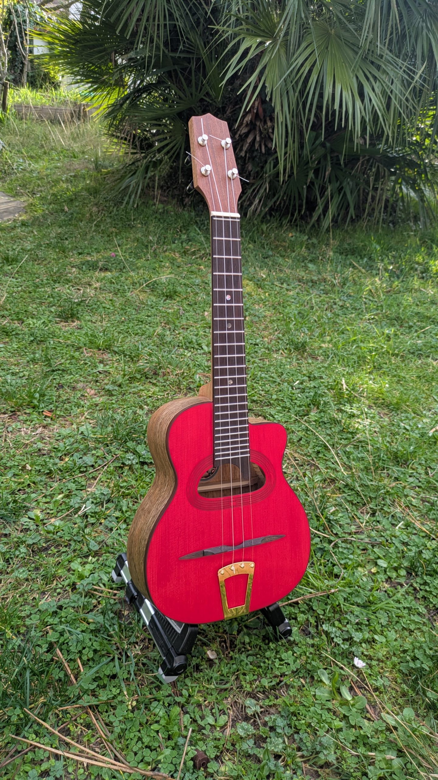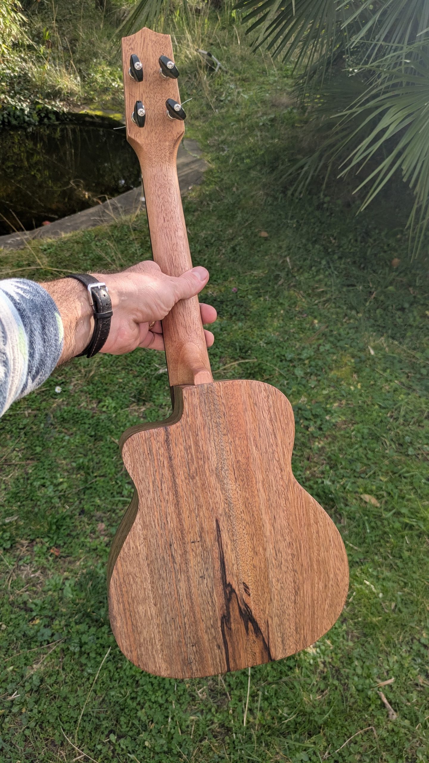 Ce ukulélé est en format concert. les éclisses et le fond sont en manguier massif des philippines, la table en épicéa AA le manche en acajou kaya, la touche en ébène, le chevalet en résine. Le chevalet est flottant mais encadré de deux moustaches fixes. filets en palissandre
