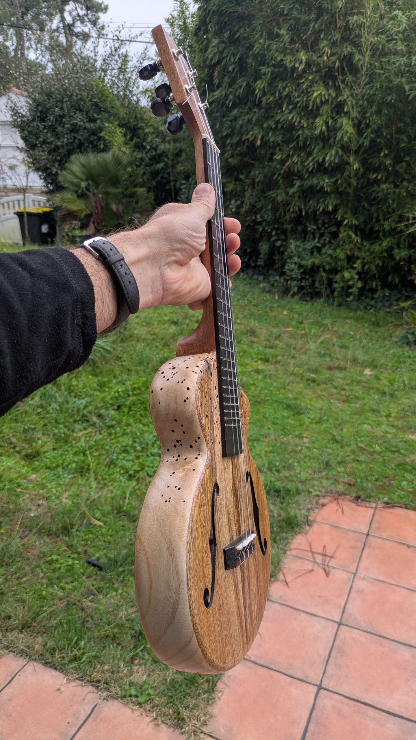 le manche est en acajou kaya les éclisses  sont en un bloc de paulownia et le fond et la table en manguier massif, la touche en ébène, le chevalet en palissandre.  a une superbe projection et une très belle définition du son.