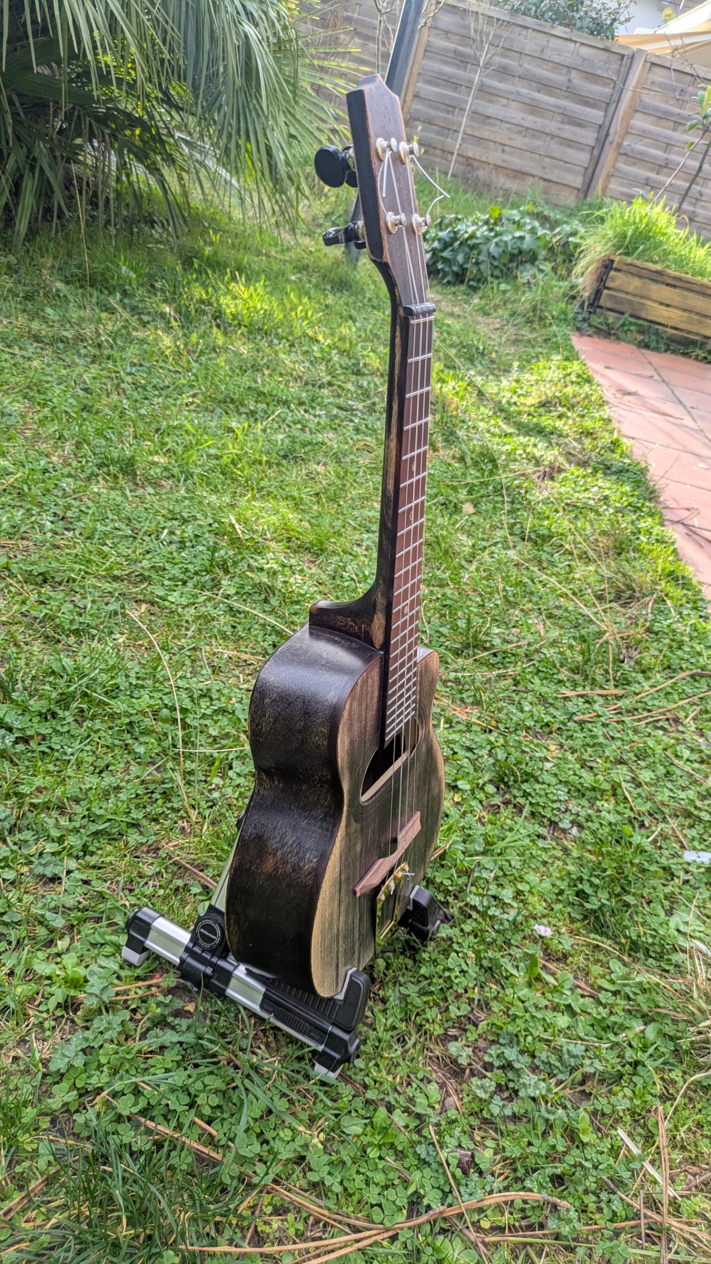 Ce ukulélé est en format concert. les éclisses et le fond sont en manguier massif des philippines, la table en épicéa AA le manche en acajou kaya, la touche en ébène, le chevalet en résine. Le chevalet est flottant. filets en palissandre