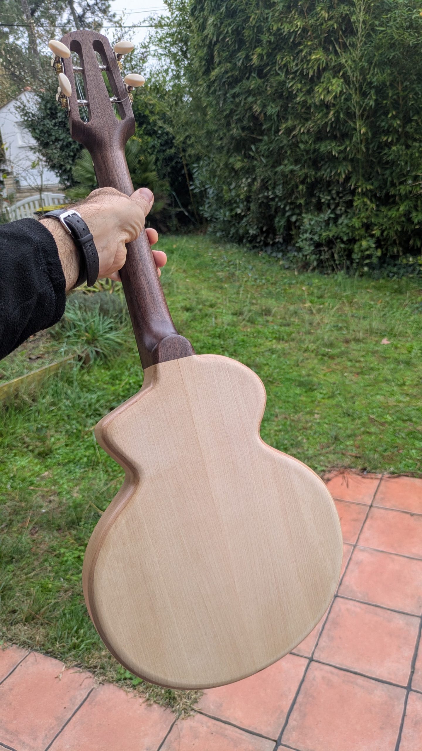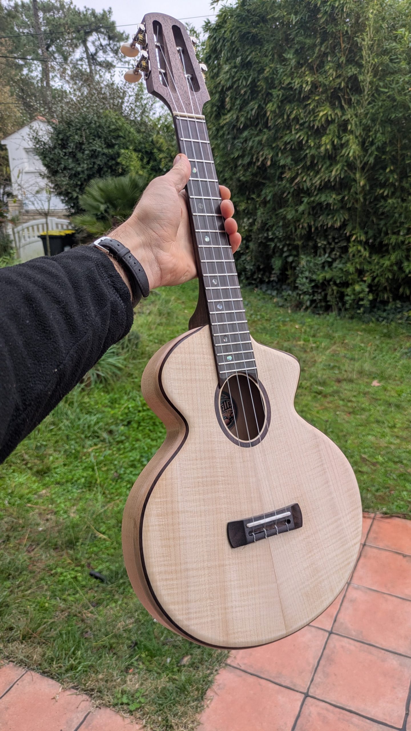 le manche est en noyer les éclisses le fond et la table sont en érable massif , la touche en ébène, le chevalet en palissandre. a une superbe projection et une très belle définition du son.